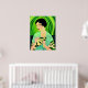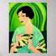 Print in an Art Deco portrait of a lady in a kimono, holding a fan, against a jade green abstract background