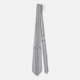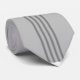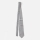 This tie has an art deco design of vertical lines with diamonds and circles in silver on a field of grey.