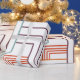 This wrapping paper has an art deco design of lines in purple, pink, orange, and blue.