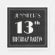 This stylish and 1920s/1930s style inspired thirteenth birthday celebration/party paper napkin design features an editable name, an intricate art deco look inspired number “13th”, the message “BIRTHDAY PARTY!”, and a multi-line border. There is a black-coloured background by default, but it can be customised to a different colour, if desired. Elegant birthday themed paper napkins like these might be used at a party celebrating somebody’s 13th birthday. [~Z0000612]
