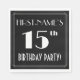 This Roaring Twenties inspired fifteenth birthday party/celebration paper napkin design features a custom name, a fancy art deco look inspired number “15th”, the message “BIRTHDAY PARTY!”, and a multi-line border. It has a black-coloured background by default, but it can be customised to a different colour, if desired. Elegant birthday themed paper napkins like these might be used at a birthday party in celebration of somebody’s 15th birthday. [~Z0000612]