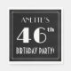 This stylish and 1920s/1930s style inspired forty-sixth birthday party/celebration paper napkin design features a custom name, an intricate art deco look inspired number “46th”, the message “BIRTHDAY PARTY!”, and a multi-line border. It features a black-coloured background by default, but it can be customised to a different colour, if desired. Stylish birthday themed paper napkins like these might be used at a party in celebration of somebody’s 46th birthday. [~Z0000612]