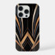 This abstract Art Deco design exudes luxury and sophistication with its sweeping metallic arcs in gold, copper, and grey against a deep black background. Symmetrical curves converge towards a central focal point, framed by sharp angular lines and vertical patterns, evoking glamour and retro elegance. Perfect for elevating home decor, office art, and stylish accessories with a timeless, opulent aesthetic.