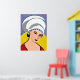 Poster in a modern, semi-abstract, Art Deco inspired portrait of a lady in red with a white turban, against a yellow and blue -grey background