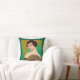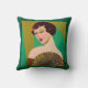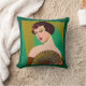 Pillow in a modern, semi-abstract, Art Deco inspired portrait of a demure lady, holding a fan, against a jade green and gold coloured background