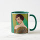 Coffee mug in a modern, semi-abstact, Art Deco inspired portrait of a demure lady, holding a fan, against a jade green and gold coloured background