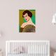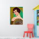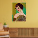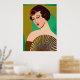 Poster in a modern, semi-abstract, Art Deco inspired portrait of a demure lady, holding a fan, against a jade green and gold coloured background