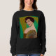 Sweatshirt in a modern, semi-abstract, Art Deco inspired portrait of a demure lady, holding a fan, against a jade green and gold coloured background