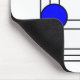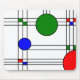 This mouse pad has an art deco stained-glass window design of black lines and red, blue, and green squares and circles.