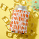 This can cooler has an art deco design made of ovals and half ovals in white and shades of orange.