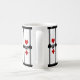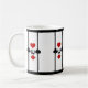 Perfect for drinks on Poker Night or your next Card Party, this personalised coffee mug features an Art Deco inspired original design w/ a card playing theme composed of 4 sets of bright red & black card suit symbols (diamond, clover, heart & spade) w/a custom text field for your monogram in the centre, set on a snow white background w/ black thick & thin vertical stripes & thick top & bottom borders.
