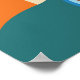 The background consists of vibrant geometric shapes, including a large red circle behind her head and a diagonally split rectangle (light and dark beige) outlined in orange. An orange vertical rectangle adds contrast. The entire composition avoids shading, relying on sharp colour blocks for depth and dimension.