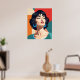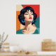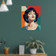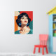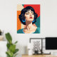 A stylised, vector-based illustration inspired by early 20th-century poster art and Art Deco features a young woman with a light skin tone. Her head is turned slightly to her right, gazing upward with short, dark wavy hair framing her face. Her eyes are sharply outlined in black with light beige irises, and her lips are a striking red. She wears bold circular blue earrings and a teal garment with a blue-and-white layered design, accentuated by clean, geometric lines.