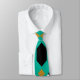 This tie has an art deco quilt-inspired design of diamond shapes in black, white, and tan on a field of teal.