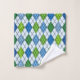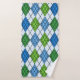 This towel set has an art deco design of diamond shapes made from overlapping angles in black lines coloured in shades of blue and green with diagonal black lines making the design look like argyle