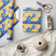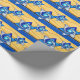 Gorgeous glossy gift wrapping paper features Jewbilee's original digital painting of an Art Deco inspired stained glass Star of David in varying shades of royal blue floating above a 3 layered background of deep yellow waves, silver on black greek key, and royal blue horizontal stripes.