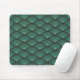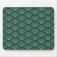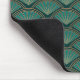 Abstract geometric wavy pattern in Art Deco style on with teal green and copper coloured waves and fan decoration on dark teal green colour background