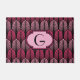 Doormat in a vintage Art Deco wallpaper pattern based on a stylised feather - deep fuchsia pink and soft pink, on a black background with customisable monogram