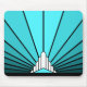 An iconic pattern of the sun rising from behind a stylised art deco shaped building. A simple yet elegant design, true to the era.