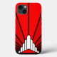 An iconic pattern of the sun rising from behind a stylised art deco shaped building. A simple yet elegant design, true to the era.