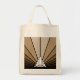 An iconic pattern of the sun rising from behind a stylised art deco shaped building. A simple yet elegant design, true to the era.