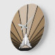 An iconic pattern of the sun rising from behind a stylised art deco shaped building. A simple yet elegant design, true to the era.