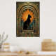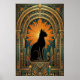 This striking art deco cat artwork showcases a black feline sitting proudly on a geometric pedestal, framed by a dramatic gold sunburst halo and ornate arches. Rich teal and amber tones echo classic 1920s design for a luxurious vintage feel. Perfect for cat lovers and art deco interiors, this piece adds instant elegance to any living room, office or hallway.