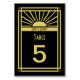 This art deco sunburst table number card features a sunburst as the focal point with the name of the bride and groom right below the sunburst. The design is featured in black and gold with the word Table and number in gold on a black backdrop. This is a wonderful table number card for an art deco roaring 20s vintage themed wedding. Copyright henishouseofpaper