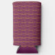 This seltzer can cooler has an art deco design of semi-circles and lines that look like a sunrise in gold on a field of eggplant.
