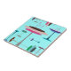 Art Deco styled design in turquoise, pink, grey and a splash of purple. Images look like futuristic towers with long poles and topped with antenna. Is it retro or science fiction?