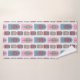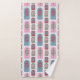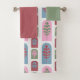 This towel set has a green washcloth, a beet hand towel, and a bath towel with an art deco design of repeating dome shapes with tree shapes inside them. If you like the design but prefer different colours, message me.