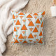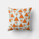 This throw pillow has an art deco design of triangles strung on teal lines in two shades of orange.