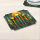 Beautiful, vintage art deco paper coaster with a geometric pattern in shades of green, turquoise and gold. The centre of the tile depicts the rising Sun.