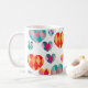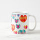 This mug has an Art Deco design of hearts made from diamonds together in shades of pink, blue, green, gold, and red.