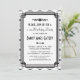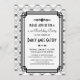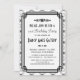 These birthday party invitations feature a white and black colour palette, a geometric frame, geometric patterns, and other stylistic details all inspired by Art Deco and the roaring twenties. You can customise the sample text fields to your liking.