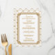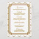 These menu cards feature a white and gold colour palette, a geometric frame, geometric patterns, and other stylistic details all inspired by Art Deco and the roaring twenties. You can customise the sample text fields to your liking.
