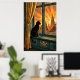 A contemplative black cat silhouette perches elegantly on a teal geometric windowsill, framed by stylized golden curtain folds and warm orange sunset rays. This serene 1920s art deco composition brings peaceful sophistication to bedrooms, hallways and living rooms, creating a perfect focal point for cat enthusiasts and modern decor lovers.