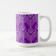 This mug has an art deco design of diamond shapes and lines in silver on a field of purple.