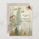 A delightful fantasy art illustration in a modern style depicts a bird family among various tall, light, medium, and dark green pine trees, with a creamy background and flowers.