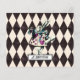 Vintage Alice in Wonderland illustration is Alice putting on a crown ( on front). Background is textured charcoal and ivory harlequin pattern.