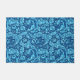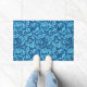 Doormat in a William Morris design of stylised acanthus leaves and bachelors button blossoms, digitally enhanced and coloured in soft sky blue, outlined in indigo, on a deep cerulean blue background