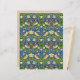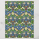 Paper in a William Morris Art Nouveau tapestry pattern of stylised birds, flowers, strawberries, and leaves in soft shades of blue, green, beige and tan on a dark indigo blue background