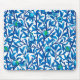 Mouse pad in a William Morris Art Nouveau tapestry pattern of exotic birds in a pomegranate tree, with cobalt and cerulean blue leaves, birds and fruit in cobalt blue and turquoise accented with lime green, with a white background