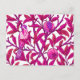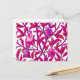 Postcard in a William Morris Art Nouveau tapestry pattern of exotic birds in a pomegranate tree, with fuchsia pink and violet leaves, birds and fruit in fuchsia, violet and sapphire blue, and a white background