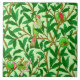 Tile in a William Morris Art Nouveau tapestry pattern of exotic birds in a pomegranate tree, with emerald green leaves, birds and fruit in lime green and deep ruby red, and a pastel lime green background