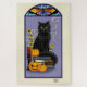 A black cat sitting on a pile of books with a red candle, pumpkins, black eyed susans and a stain glass butterfly in a backdrop of purple and light yellow.