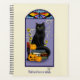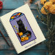 A black cat sitting on a pile of books with a red candle, pumpkins, black eyed susans and a stain glass butterfly in a backdrop of purple and light yellow.