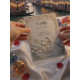 Capture the timeless elegance of a fairytale union with this heritage-style design, featuring a romantic garden scene in a soft, monochromatic ivory palette.This design draws inspiration from the grandeur of early 20th-century craftsmanship, presenting a sophisticated visual narrative. The background simulates a sculpted limestone surface, creating a high-fidelity visual texture of bas-relief masonry. Central to the composition is a classically rendered scene of a groom kneeling before a bride within a formal architectural gazebo, surrounded by a cobblestone path. The imagery is framed by quintessential Art Nouveau biological curves, featuring swirling vines and delicate pastel blue tulips that break the monochrome ivory and cream spectrum. The typography hierarchy balances formal serif headers with elegant calligraphy script for names, ensuring legibility against the textured backdrop.This is a flat printed image with a faux carved stone effect, not actual raised material or deep embossing.