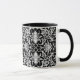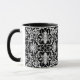 Art Nouveau textile pattern coffee mug, based on a vintage William Morris chinoiserie ceramic tile design, digitally rendered and coloured for a soft, watercolor effect - charcoal grey and white on a black background