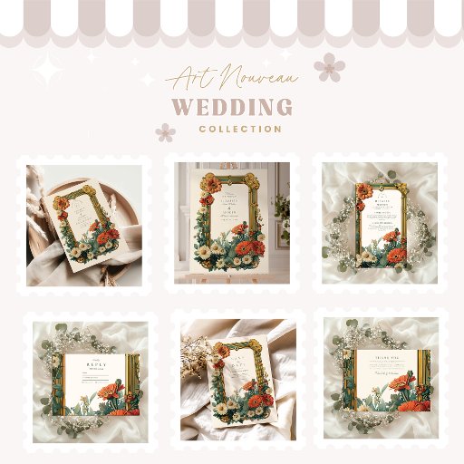 A bright and joyful wedding design featuring a golden Art Nouveau frame adorned with blooming daisies and gerbera flowers. The floral composition in rich shades of ivory, orange, red, and green evokes the warmth of a sunlit garden, blending vintage elegance with cheerful charm. Perfect for spring or summer weddings with a natural, romantic theme.
